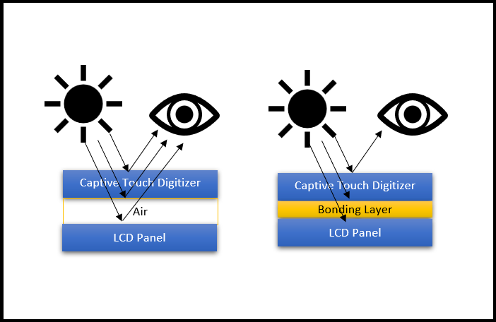 Standard touch monitors have an air gap between the display and the protective glass, which can cause light refraction and glare, reducing screen clarity. Optical bonding removes this gap, minimizing internal reflections and improving contrast. The result is: